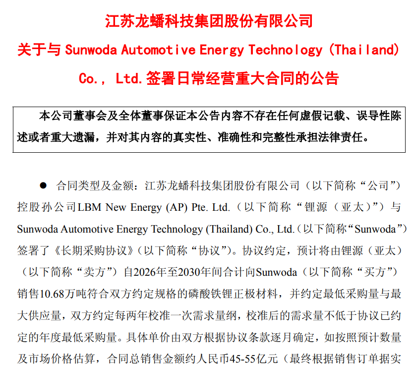 12月2日晚间,龙蟠科技发布公告称,公司控股孙公司LBM New Energy (AP) Pte. Ltd.(以下简称“锂源(亚太)”)与Sunwoda Automotive Energy Technology (Thailand) Co., Ltd.(以下简称“Sunwoda”)签署《长期采购协议》,预计将在2026年至2030年间合计向Sunwoda销售10.68万吨磷酸铁锂正极材料,合同总销售金额约45亿至55亿元。